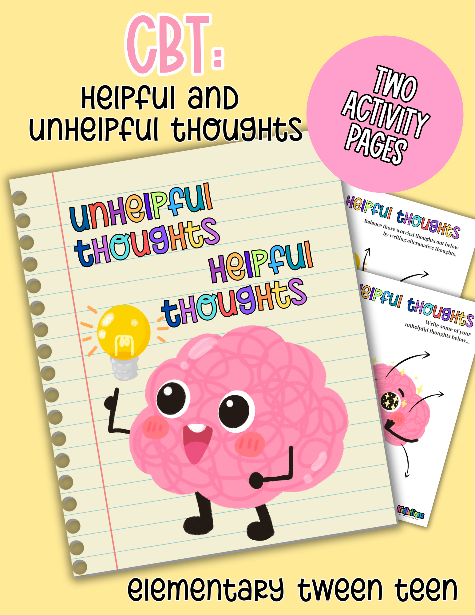 A CBT approach to help kids/teens identify unhelpful and helpful thoughts. Frist, identify the unhelpful thoughts, then balance them out and write thoughts that are more helpful.