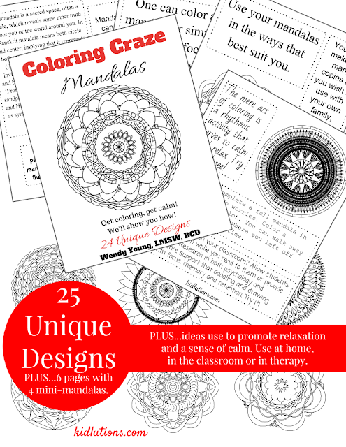 Suitable for upper elementary and beyond. In my own practice, I have used mandalas for years with kids, teens and adults, to help them focus and relax during sessions. I like them for the rhythmic coloring opportunity they provide. The back and forth of shading in of the spaces is very calming to the limbic brain. Use mandalas in the classroom to improve focus, concentration and memory.