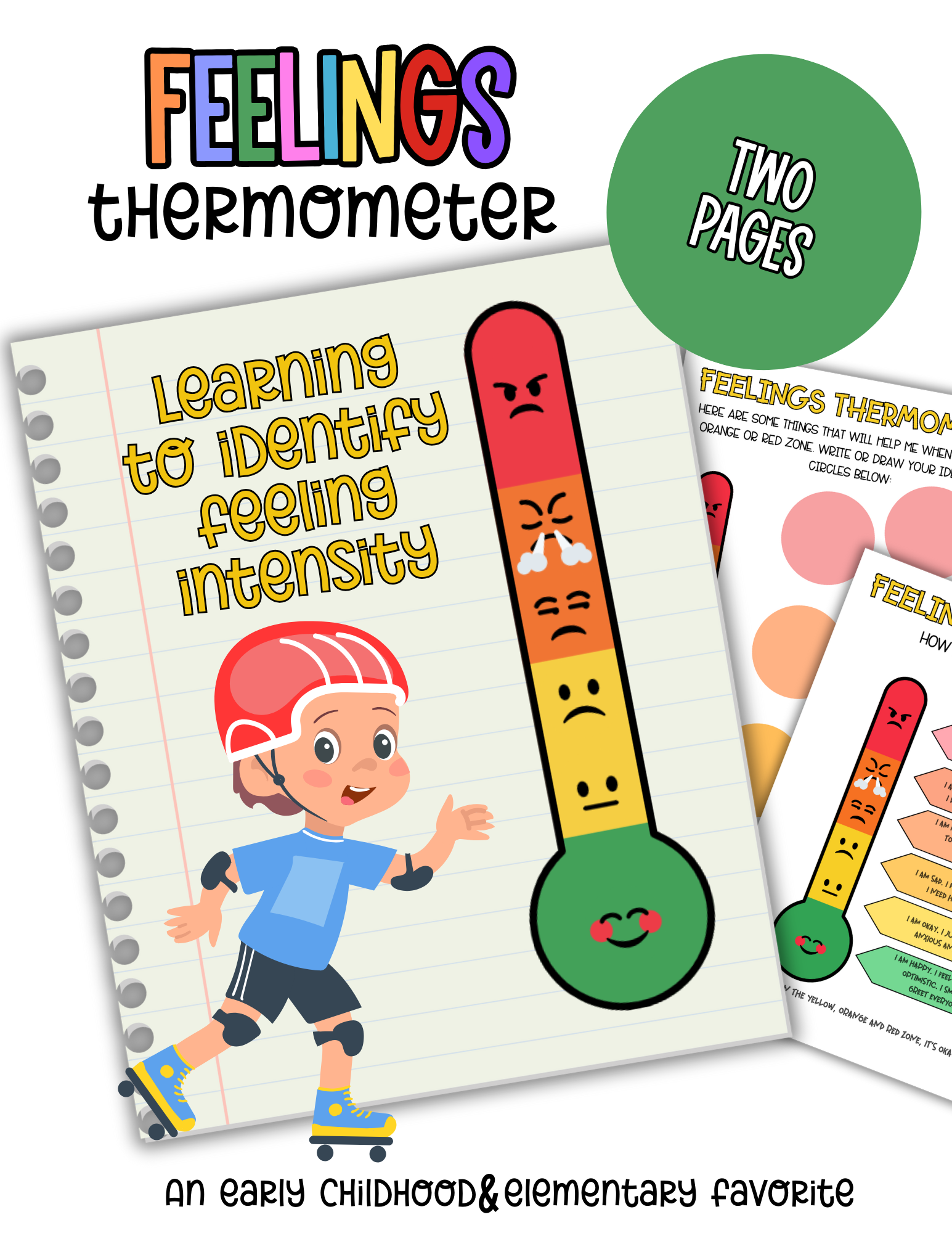 Help kids learn to identify as they move through different levels of intensities of feelings. It's just as important to help them recognize when they are "cooling down" and moving back down the thermometer, as when they are moving up. The second page helps kids communicate what might of assistance to them as they move through more intense feelings.