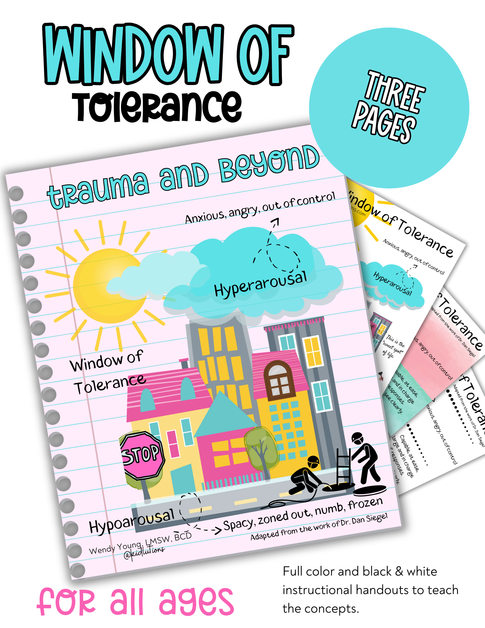 The Window of Tolerance is a crucial framework to help explain emotional states as they relate to trauma, and really, for all of humankind. Use with kids from Upper Elementary through Adulthood, although this can also be used by therapists and counselors who can adapt to use with younger children. These three pages are instructional sheet handouts that help folks understand the concepts developed by Dr. Dan Siegel.