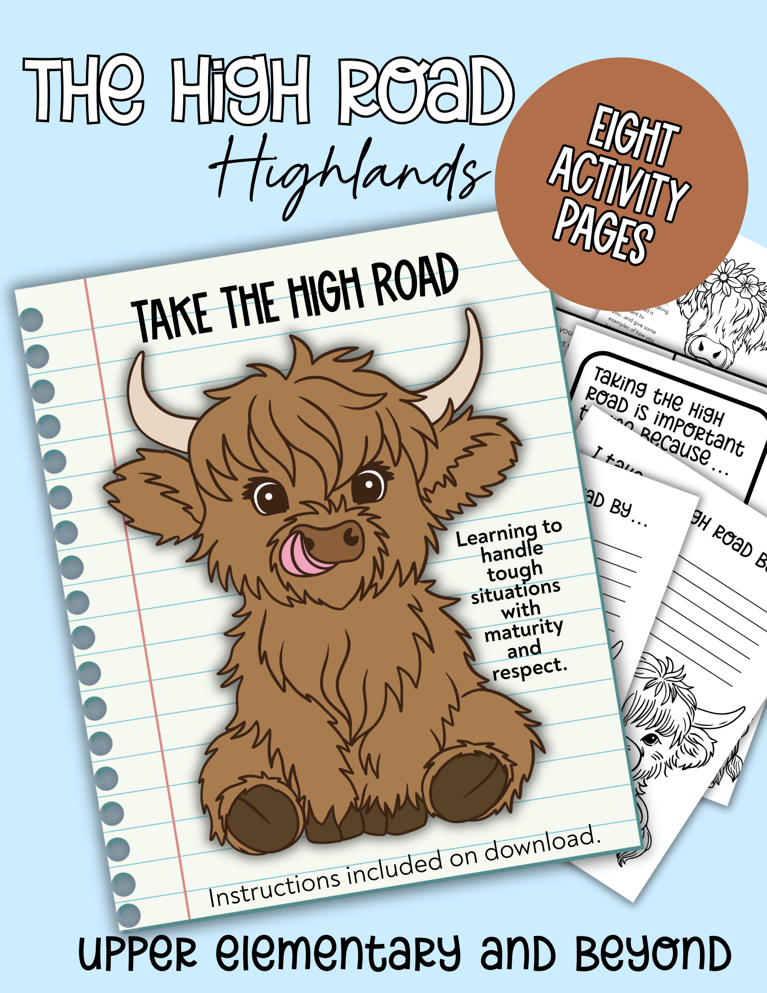 Learn to take the "high road" when dealing with tough situations. Includes 10 scenario cards to explore, discuss, use for role-plays (your choice), plus worksheets that reinforce the concept of taking the high road. For use with upper elementary and beyond!