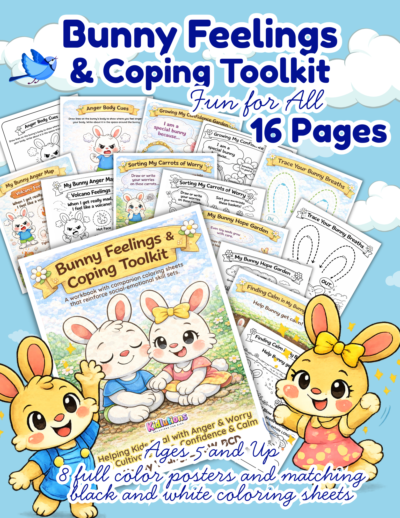 These bunnies help kids learn to cope with anger, worry, self-esteem and more! 16 pages total: 8 full color posters and 8 matching coloring/worksheet pages for kids! READ BELOW FOR MORE DETAILS.
