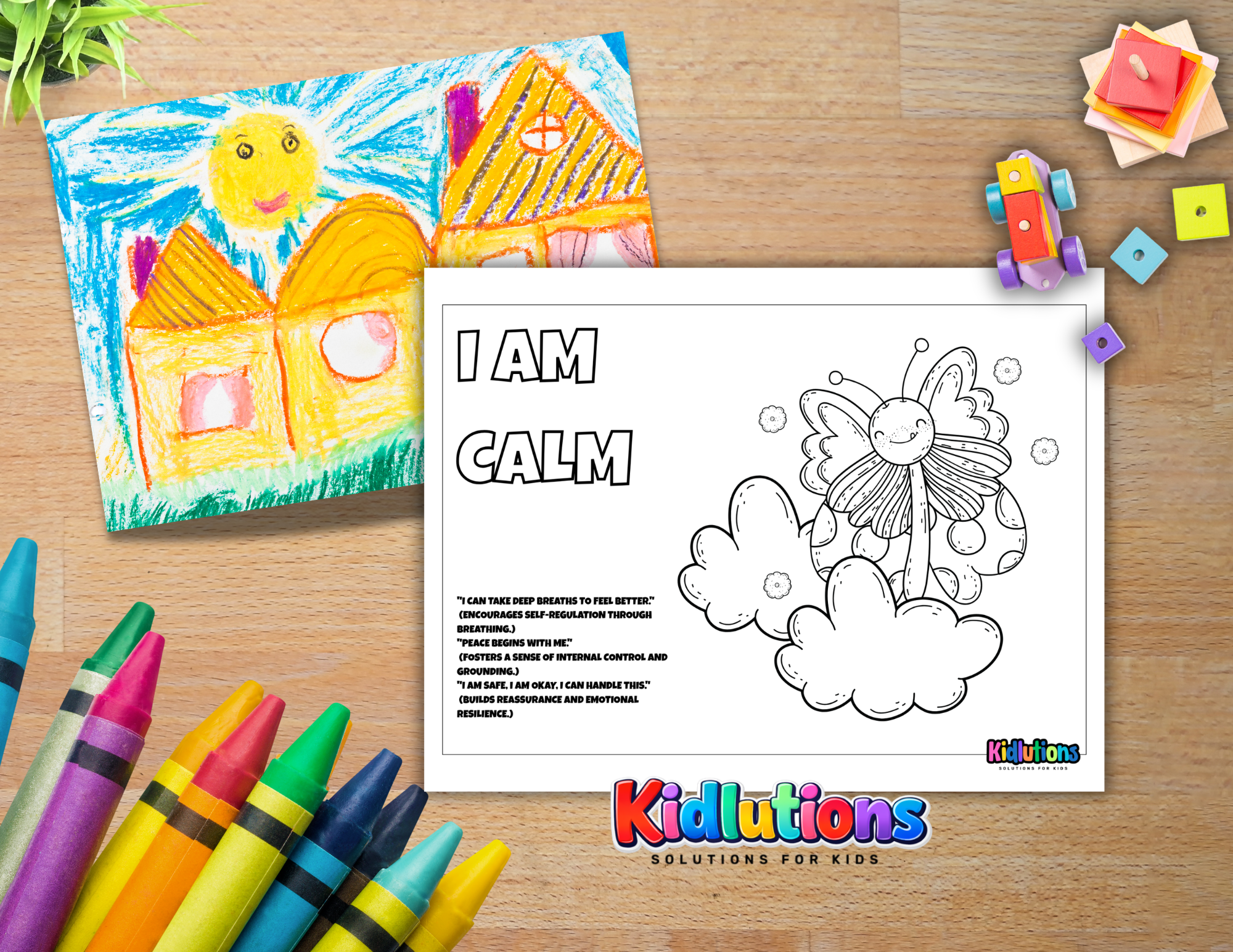 Help kids learn calming skills by the very act of coloring, as well as by repeating the mantras and intentions included on this coloring page.